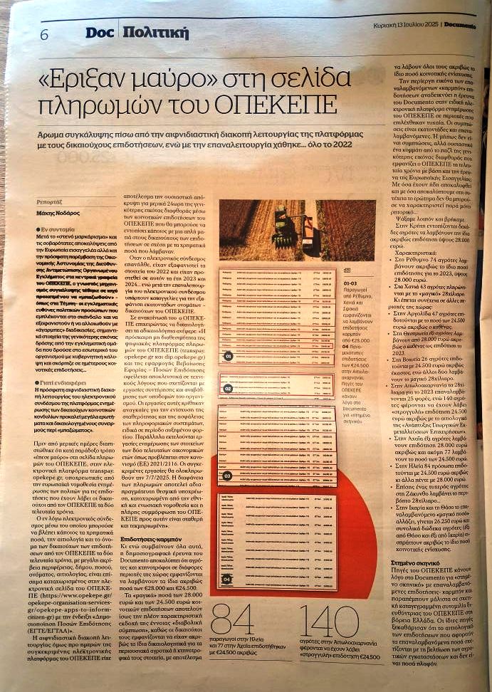 Οταν ο ηλεκτρονικός σύνδεσμος επανήλθε, είχαν εξαφανιστεί τα στοιχεία του 2022 και είχαν προστεθεί σε αυτόν τα έτη 2023 και 2024… ενώ μετά την επαναλειτουργία του ηλεκτρονικού συνδέσμου υπάρχουν καταγγελίες για την εξαφάνιση εκατοντάδων ονομάτων – δικαιούχων του ΟΠΕΚΕΠΕ.