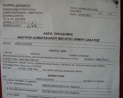 Β) Η άδεια για την ανέγερση του συγκεκριμένου κτιρίου φαίνεται να εκδόθηκε παράτυπα καθώς βρίσκεται εκτός του ισχύοντος νομικού πλαισίου στο θέμα του αριθμού των ορόφων. Συγκεκριμένα από την άδεια προβλέπεται τριόροφο κτίριο, ενώ με βάση το ΠΔ περί οικισμών (ΦΕΚ 138 Δ.13.3.81) , σε οικισμούς πριν του 1923 όπως είναι η Ζαχάρω Ηλείας επιτρέπεται η ανέγερση κτιρίων μέχρι δύο ορόφους.