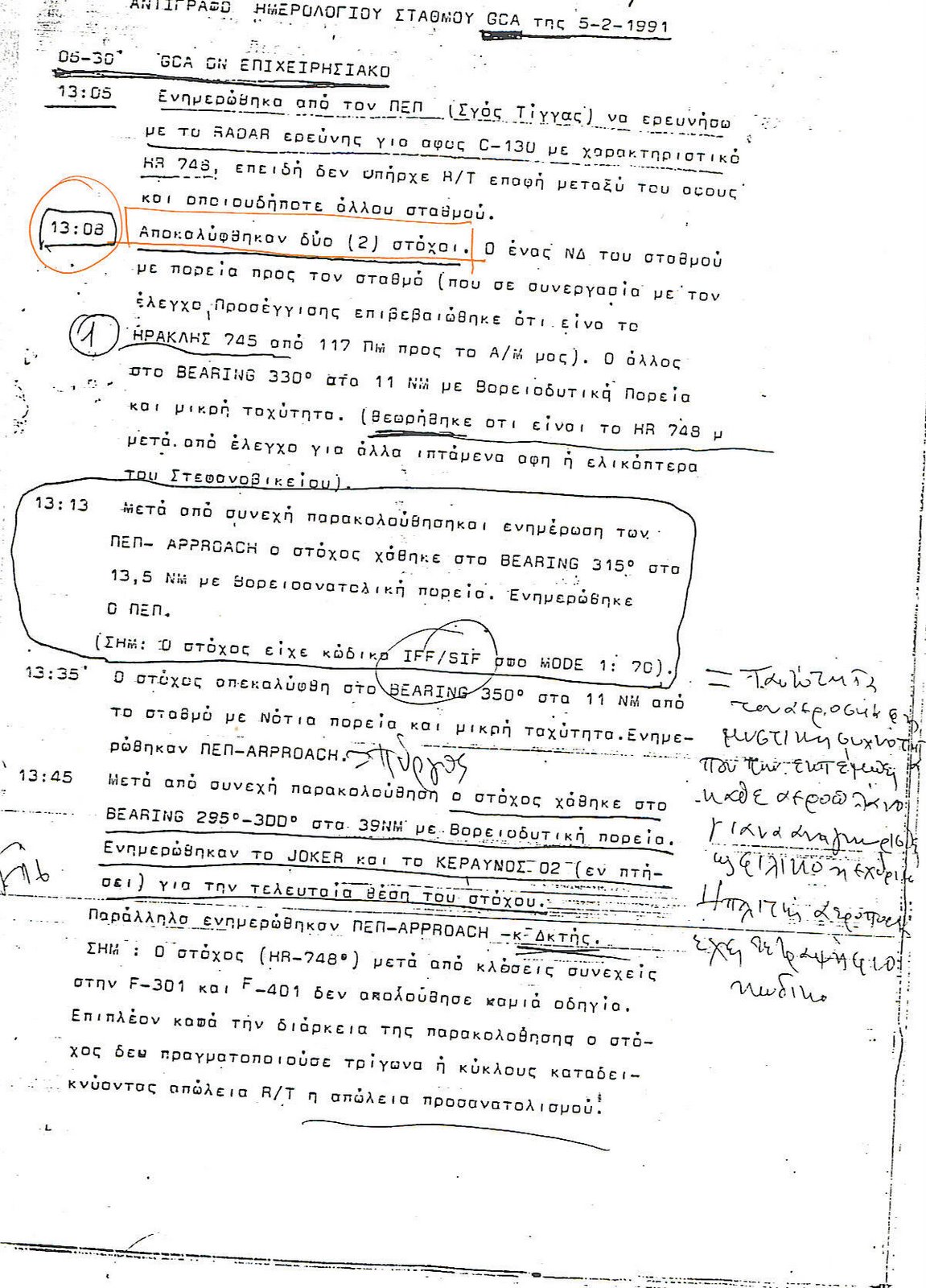 Η τελευταία του επαφή με τον πύργο ελέγχου της 111 ΠΜ ήταν στις 12.55 μ.μ. κι ενώ είχε αρχίσει η διαδικασία προσγείωσης διά οργάνων, λόγω χαμηλής νέφωσης και κακοκαιρίας που επικρατούσε στην περιοχή.Οκτώ αεροσκάφη F-16 μπήκαν αμέσως στο μηχανισμό διάσωσης ο οποίος αργότερα συμπληρώθηκε με δυο C-130, δυο πυροσβεστικά CL-215, ενώ λίγο αργότερα στη δύναμη διάσωσης προστέθηκαν δυο ελικόπτερα Σινούκ, ελικόπτερα του Ναυτικού και αεροσκάφη ναυτικής συνεργασίας P-3C Οράιον κι ένα S-3 Βάικινγκ.