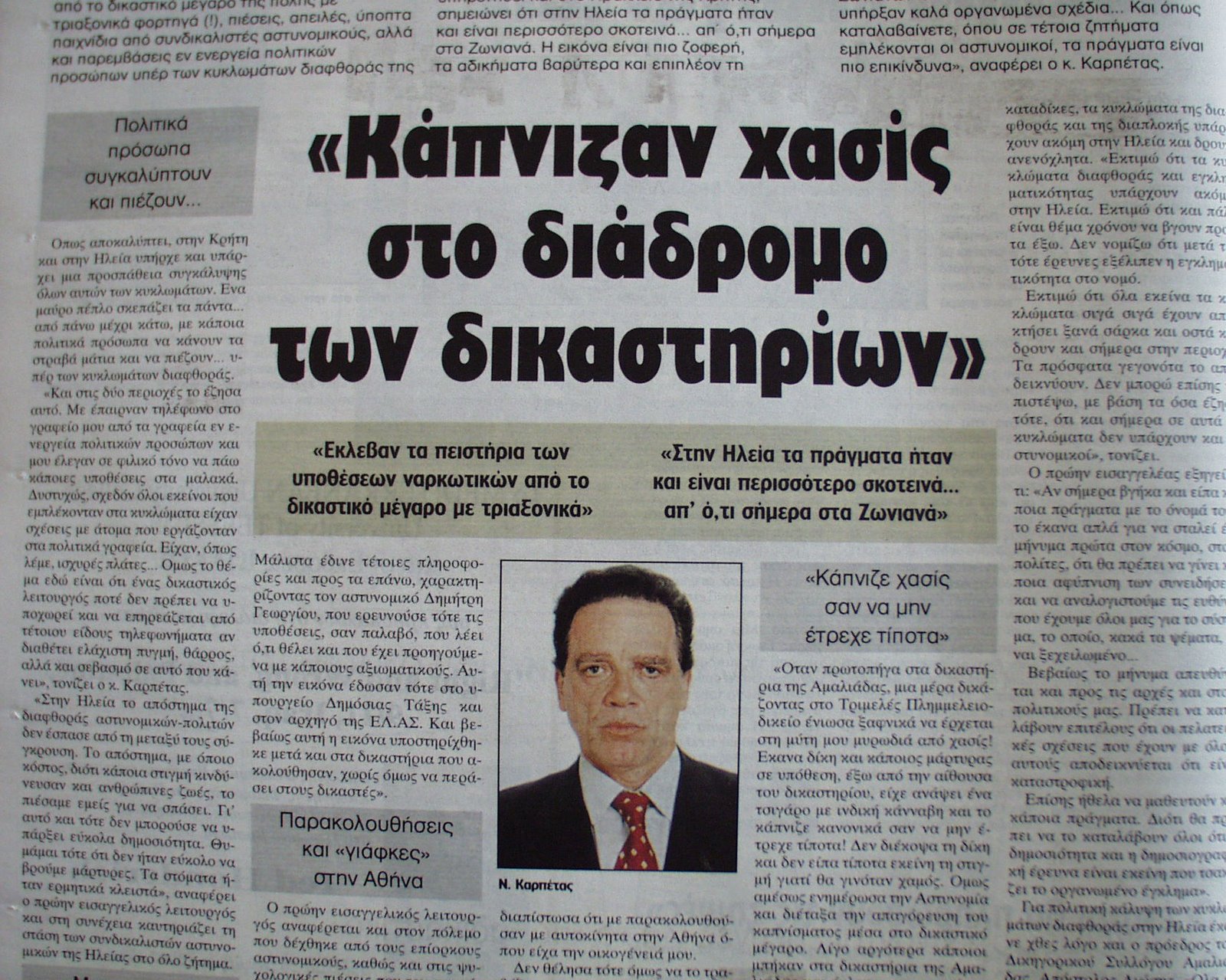 «Το είχε πει κι ο παλιός μας νομάρχης: το χασίσι της Ηλείας είναι ΑΑΑ», λέει ο Μάκης, ο ανταποκριτής μας στον Πύργο. Καλές καβάτζες, πλούσια χώματα, ποτάμια, ρεματιές: το σκηνικό είναι ιδανικό για το απαγορευμένο χορτάρι. Η καλλιέργεια του χασίς είναι στο νομό οικογενειακή υπόθεση χρόνια τώρα. Κάποια χρονική περίοδο, όταν τα πράγματα ζόρισαν για τους εδώ καλλιεργητές, παρατηρήθηκε το φαινόμενο της μετανάστευσης σε άλλους νομούς και εξαγωγή τεχνογνωσίας σε δύσβατες περιοχές της Μεσσηνίας και της Αρκαδίας.Οι αστυνομικοί που ανεβοκατεβαίνουν τους ορόφους του κτιρίου προσπερνούν βιαστικά τα δέματα με τις φούντες. Κάποιες άλλες εποχές, κάποιοι συνάδελφοί τους έστηναν πανηγύρι γύρω απ’ αυτά… Δεν πάει καιρός που χάρη στις αποκαλύψεις της «Ε» εξαρθρώθηκε ένα κύκλωμα διεφθαρμένων Ηλείων αστυνομικών, οι οποίοι καταδικάστηκαν σε πολυετείς καθείρξεις.