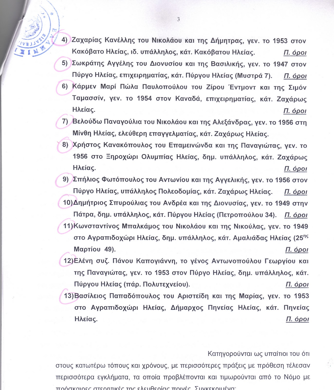 Με βάση το υπ’ αριθμ. 512/2011 πενήντα τριών! σελίδων κατηγορητήριο που υπογράφεται από την αντιεισαγγελέα Εφετών Πατρών Βασιλική Ε. Αργύρη παραπέμπονται να δικαστούν στο Τριμελές Εφετείο Κακουργημάτων οι εξής :