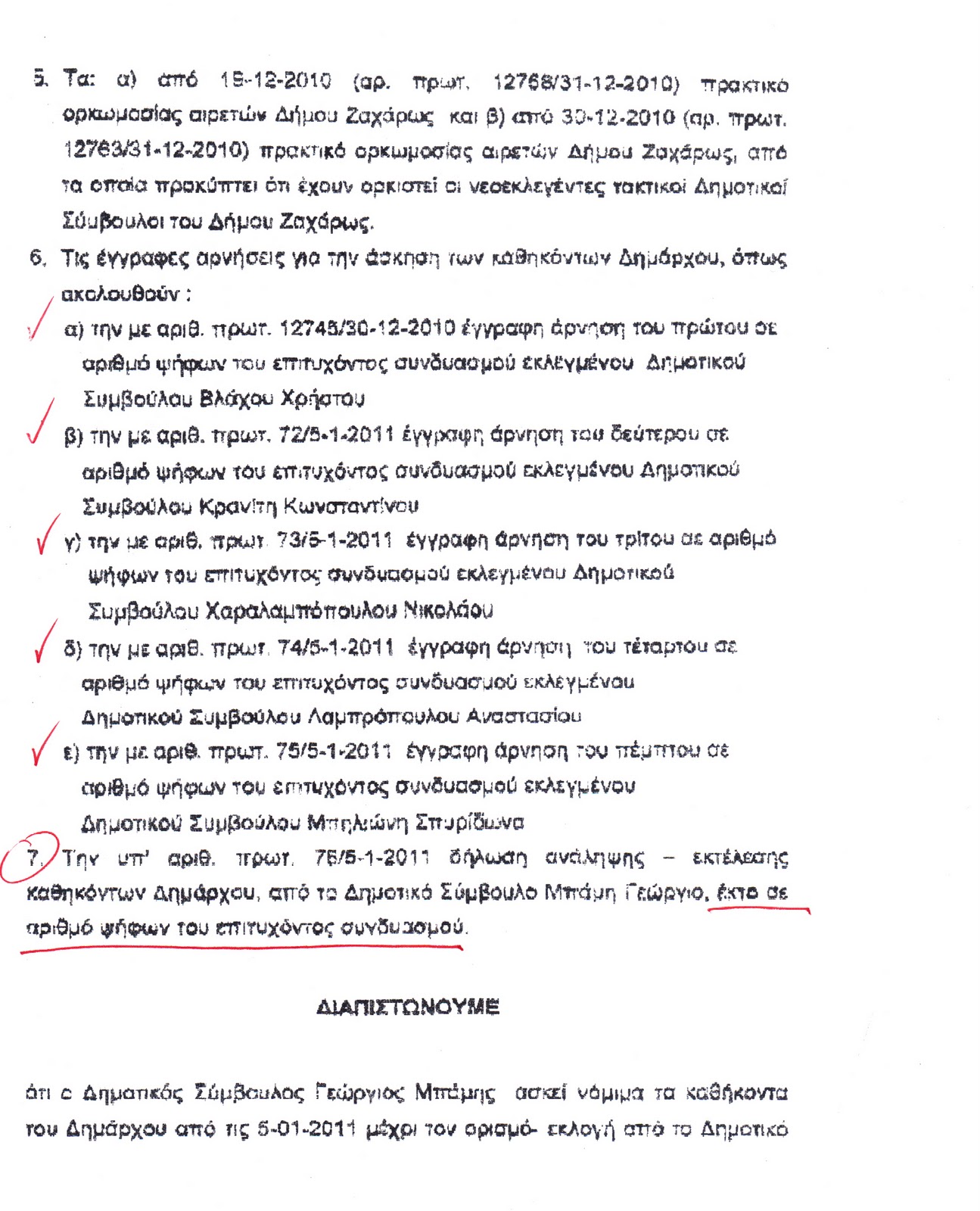 Όπως αποκαλύπτεται  στην 52/5.1.2011 νέα Διαπιστωτική Πράξη που υπογράφει ο γ.γ. της Περιφέρειας Δυτικής Ελλάδας Αναστάσιος Αποστολόπουλος , πέντε δημοτικοί σύμβουλοι της παράταξης του κ. Χρονόπουλου , ο πρώτος σε αριθμό ψήφων Βλάχος Χρήστος, ο δεύτερος Κωνσταντίνος Κρανίτης, ο τρίτος Νικόλαος Χαραλαμπόπουλος , ο τέταρτος Αναστάσιος Λαμπρόπουλος και ο πέμπτος Σπυρίδων Μπηλιώνης με έγγραφά τους αρνήθηκαν την άσκηση καθηκόντων δημάρχου στη θέση του Πανταζή  Χρονόπουλος με αποτέλεσμα να τοποθετηθεί τελικά δήμαρχος ο έκτος σε σειρά ψήφων δημοτικός σύμβουλος Γεώργιος Μπάμης.