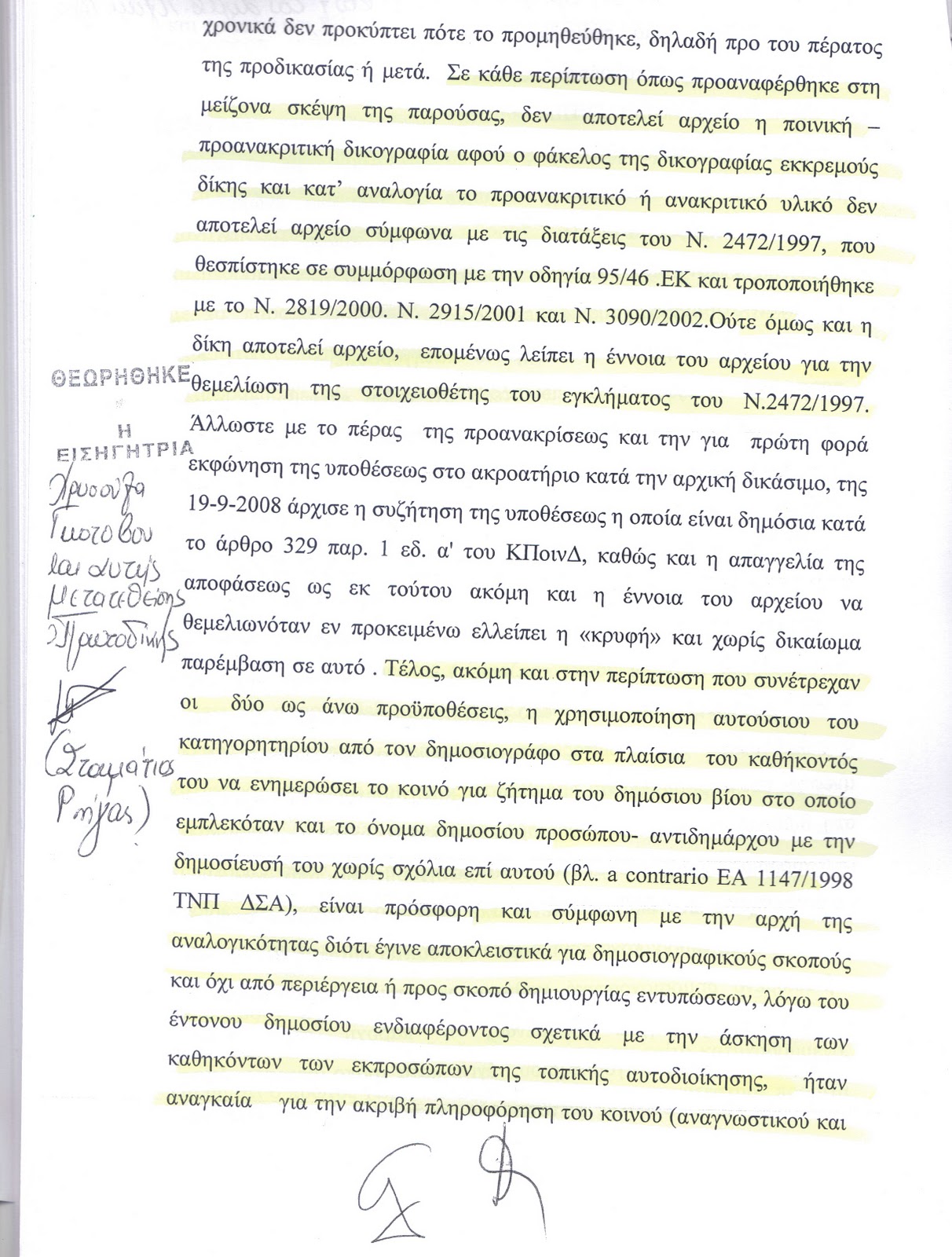 «Υπό προυποθέσεις ο δημοσιογράφος , μπορεί να παραβιάσει και τα προβλεπόμενα στον Ν.2472/1997 περί προσωπικών δεδομένων…» ενώ έκαναν δεκτό ότι : « ο φάκελος της δικογραφίας , ασχέτως αν τηρείται από δικαστική αρχή ή προανακριτική αρχή , δεν αποτελεί αρχείο με την έννοια του Ν. 2472/1997.»