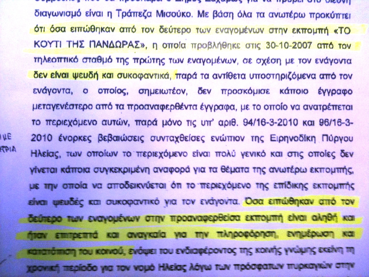 “Όσα ειπώθηκαν στην εκπομπή ΤΟ ΚΟΥΤΙ ΤΗΣ ΠΑΝΔΩΡΑΣ η οποία προβλήθηκε στις 30-10-2007, δεν είναι ψευδή και συκοφαντικά, παρά τα αντίθετα υποστηριζόμενα από τον ενάγοντα (Χρονόπουλο). Όσα ειπώθηκαν από τον δεύτερο των εναγομένων (Βαξεβάνη) στην προαναφερθείσα εκπομπή είναι αληθή και ήταν επιτρεπτά και αναγκαία για την πληροφόρηση ενημέρωση και κατατόπιση του κοινού”